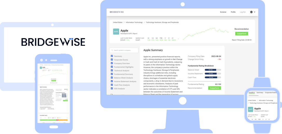 Bridgewise Customized Widgets For trading platforms: Save valuable time and resources by integrating our solution seamlessly into your platform using a simple HTML code or SDK file. Our widgets are modular, allowing you to tailor them precisely to your specific needs. Design to your brand. These widgets are fully customizable, supporting multiple languages, and providing full access to our extensive database and interactive capabilities.