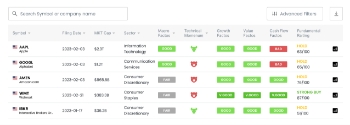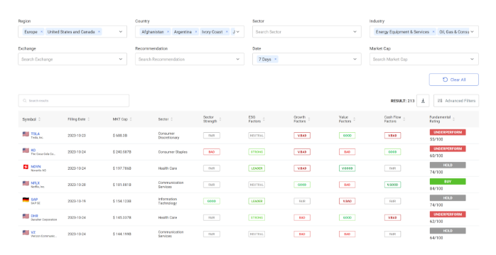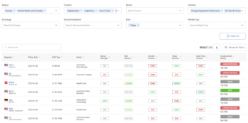 The Bridgewise screener is a filtering widget for over 37,000 stocks in over 130 stock exchanges.