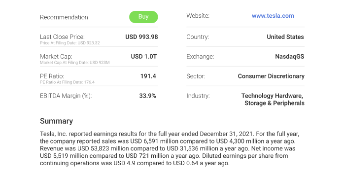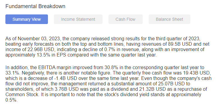 Introducing “Analysis Summary”, an AI-powered widget designed to revolutionize investment strategies for your users. This widget provides a comprehensive overview of general and fundamental results, presenting a clear picture of both strengths and weaknesses to informed investment decisions.