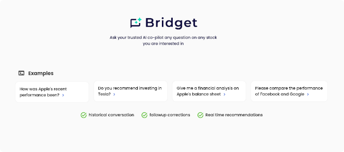 Our AI can answer real-time financial questions and deliver real human-like answers – with actual up-to-date data. A human like financial advisor!